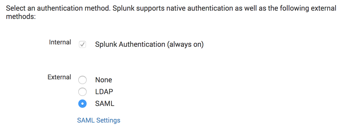- Under External authentication methods, select “SAML” and click the “SAML Settings” link