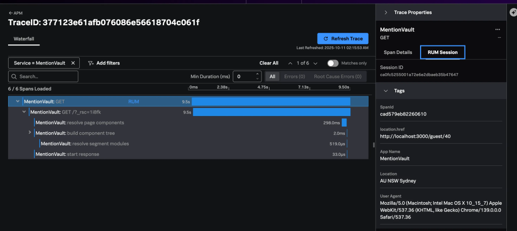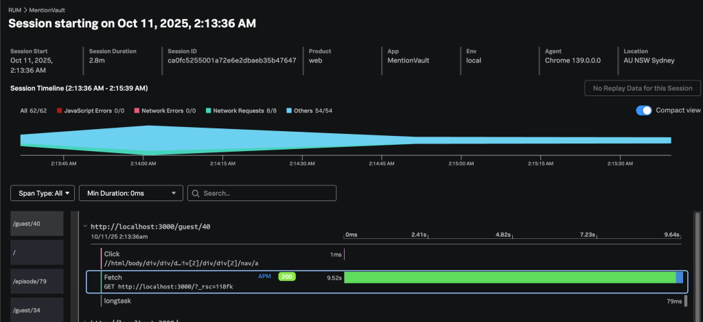 Since I already had Splunk O11y RUM configured, I could also drill down (or is it actually pan out?) to the RUM session that triggered this trace: