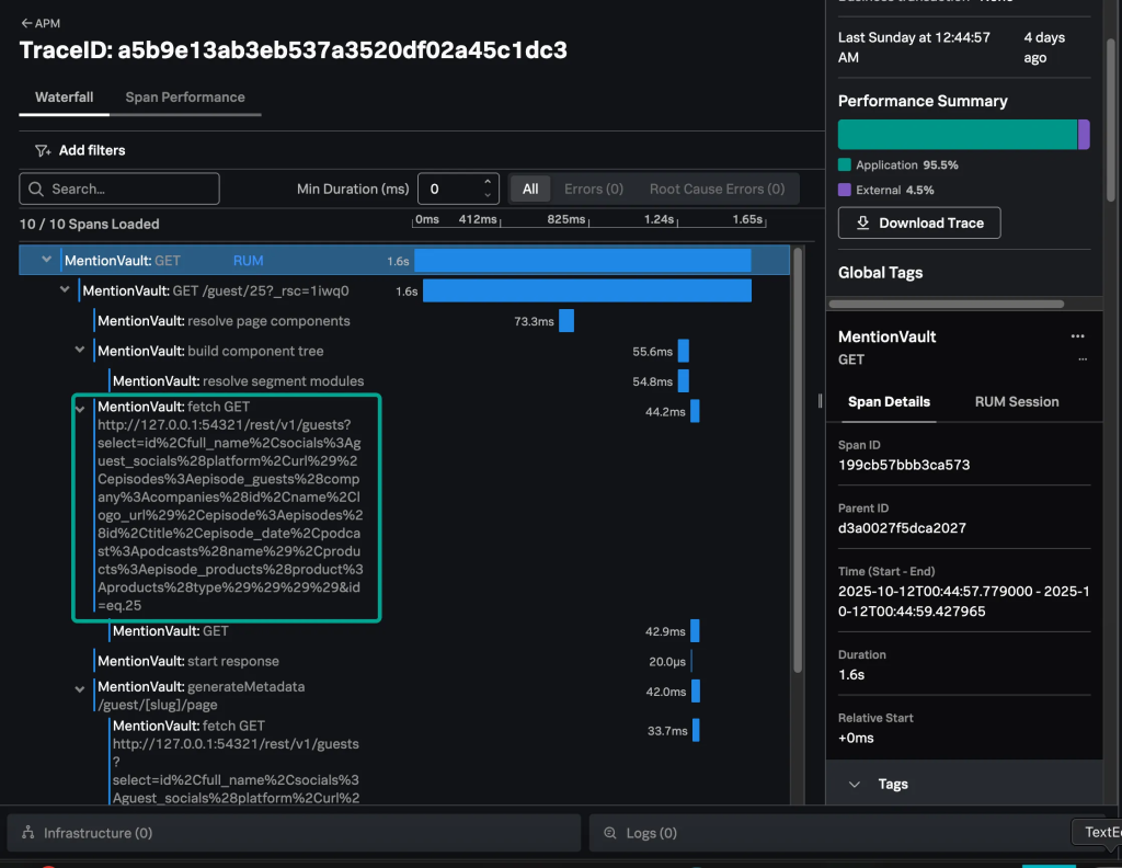 I have a little project I’m working on playing with, MentionVault.com. It’s a platform that allows you to look for guests on various podcasts and what was mentioned in each episode. So I was thinking, I can’t be that shoeless cobbler, how come I have an application and don’t have any Observability for it?! That’s how I decided to try a Splunk O11y deployment for my app.