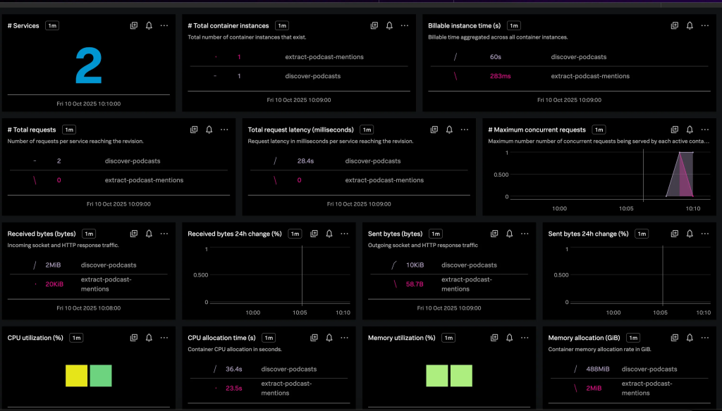 The front end of my app (the website) is a nextJS running on Vercel, the database is Supabase, batch (Python jobs) that populate the database are GCP cloud functions, and in one of them I’m using Google Vertex AI (for extractions of the mentions from the episodes metadata)…. hey look, I start to look like a proper enterprise with stuff deployed all over he place!