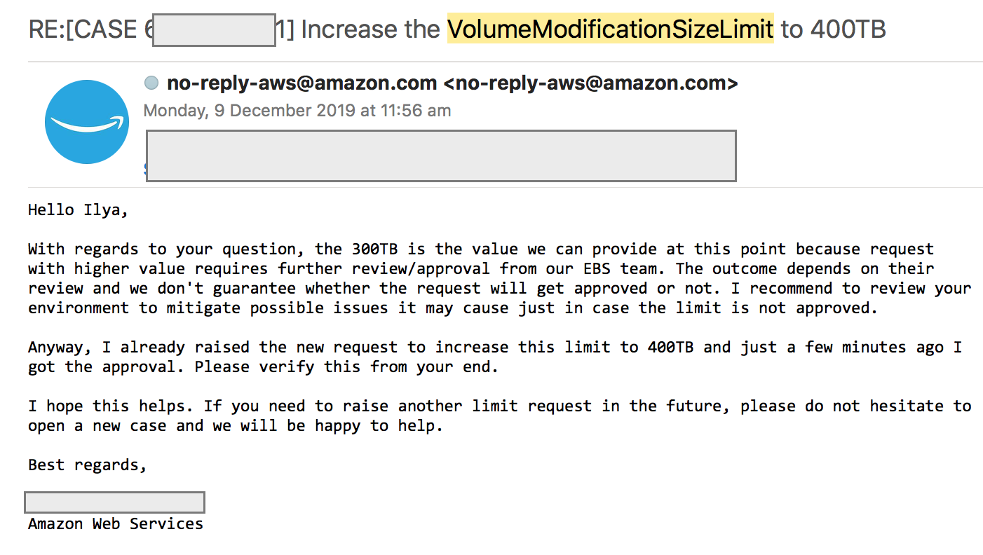 Also if you plan to extend from more than 300TB in one go you better contact AWS as soon as possible as here is what I’ve got from AWS  Support when trying to increase the value to 400TB